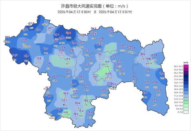 4月12日凌晨到早晨许昌出现8级以上大风天气,截至今日07时,全市63个站点极大风速达到9级以上,其中18个站点极大风速达到10级以上,5个站点达到11级,极大风速出现在禹州卧龙山32.2米/秒(11级)。