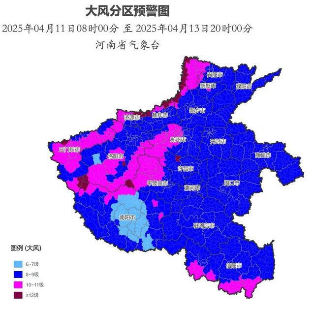 4月12日,河南多地持续发布预警信息。河南省气象局官网显示,截至4月12日6时21分,全省生效中的大风、寒潮、雷暴大风等预警信号有105条。