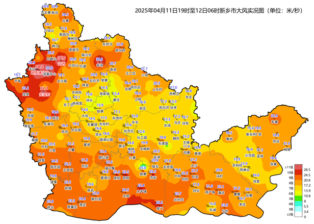 河南省气象台监测显示:11日6时至12日6时,全省大部出现8到10级阵风,部分县市11到13级,最大风力达15级;大于等于11级的有46个县(市、区)共125站,其中31站大于等于12级。预计今天强风将持续,全省阵风8到10级,中西部、北部局地达11到12级,并伴有浮尘或扬沙;明天仍有8到10级阵风。