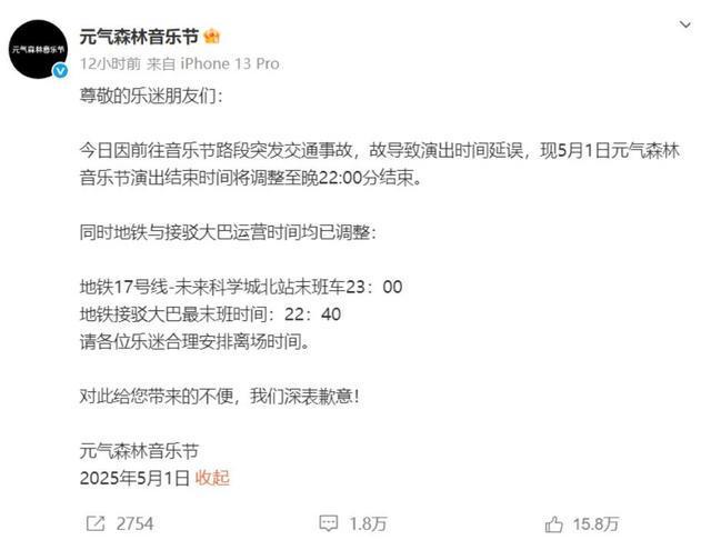 5月1日晚,@元气森林音乐节 发布致歉声明,称“今日因前往音乐节路段突发交通事故,故导致演出时间延误,现5月1日元气森林音乐节演出结束时间将调整至晚22:00分结束。同时地铁与接驳大巴运营时间均已调整。”