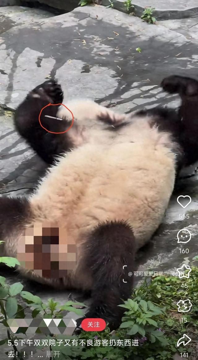 有网友在社交媒体发布视频称,5月5日在重庆动物园游玩时,发现一位游客向大熊猫“双双”扔东西。该网友还在视频评论区留言表示,扔进展览区的物品是藿香正气液玻璃药瓶。