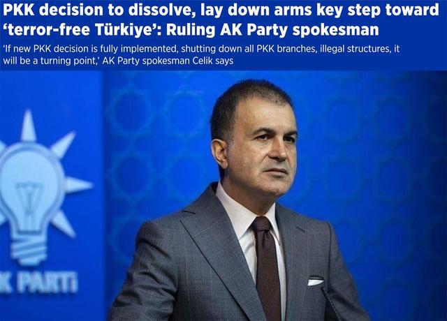 土耳其执政党正义与发展党发言人厄梅尔·切利克则强调,库尔德工人党的解散不仅是实现“无恐怖主义的土耳其”的重要里程碑,还必须确保其所有分支和延伸组织同步执行这一决定,以彻底消除潜在的安全隐患。