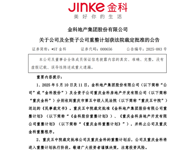 近日,金科及其全资子公司重庆金科房地产开发有限公司(下称“重庆金科”)分别收到《民事裁定书》,二者的重整计划得到批准,将进入重整计划执行阶段。