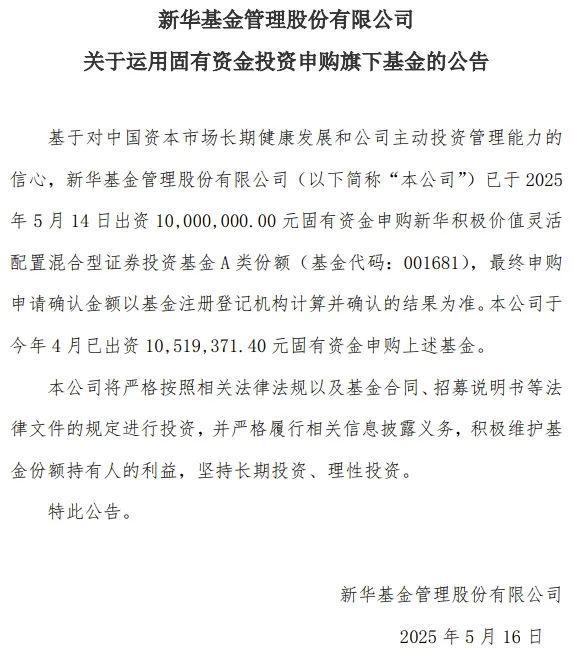5月16日,新华基金发布公告称,基于对中国资本市场长期健康发展和公司主动投资管理能力的信心,已于5月14日出资1000万元固有资金申购新华积极价值A类份额。该公司于今年4月已出资1051.94万元固有资金申购前述基金。