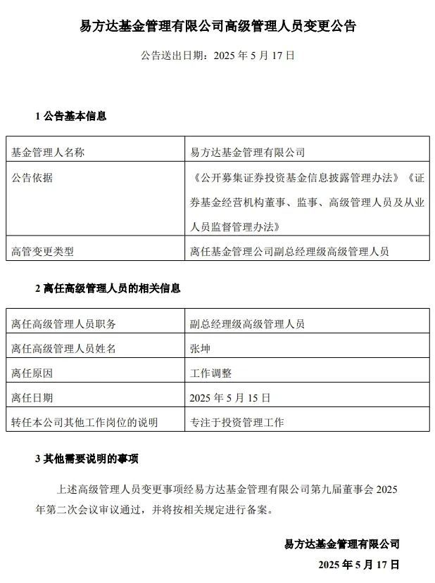 5月16日晚,易方达基金发布高级管理人员变更公告称,因工作调整,张坤不再担任副总经理,将专注于投资管理工作。