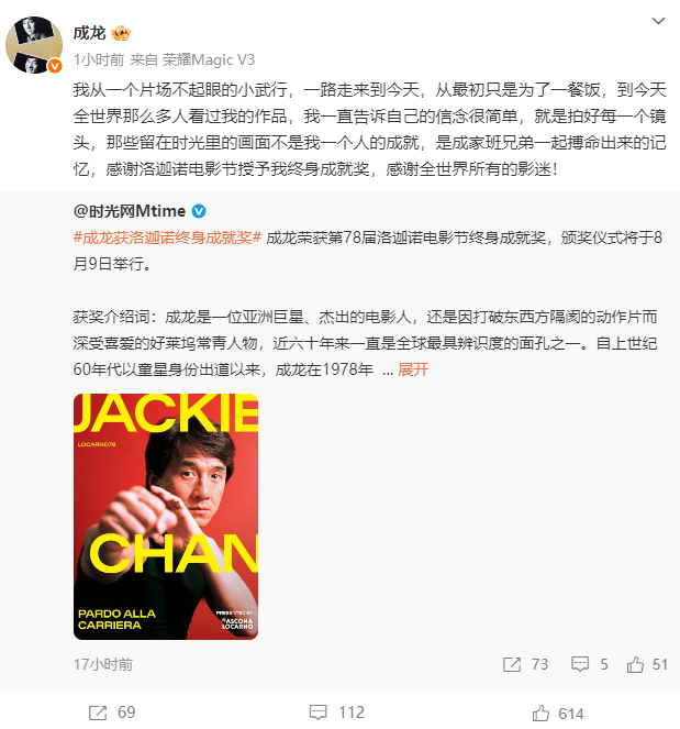 成龙写道:“从一个不起眼的小武行,到如今被全世界影迷熟知,我的每一步都离不开团队的支持和观众的喜爱。那些留在时光里的画面,是成家班兄弟们用生命拼出来的记忆。感谢洛迦诺电影节授予我这项荣誉,也感谢所有支持我的影迷朋友。”
