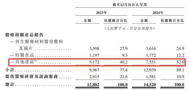 此外,报告期内,再生医学材料医用敷料及补片销售的收益分别为360万元及360万元,占总收益的比例分别为27.9%及24.9%。