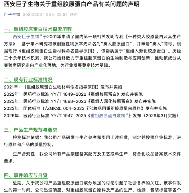 6月23日晚间,巨子生物再次发布相关声明,内容回溯了重组胶原蛋白技术的探索历程、现有行业标准、产品生产规范与要求、事件响应和自查,以及下一步措施。
