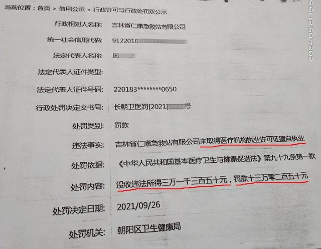 2021年9月26日,长春市朝阳区卫康局因其擅自执业作出罚款的处罚决定。