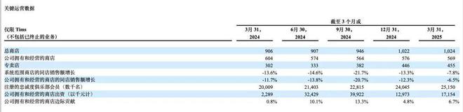 结合业绩来看,Tims营收已连续两个季度下滑,2024年三、四季度营收分别为3.6亿元、3.3亿元,今年一季度下降至3亿元。经营方面,Tims直营门店可比同店销售额已连续5个季度呈现负增长。