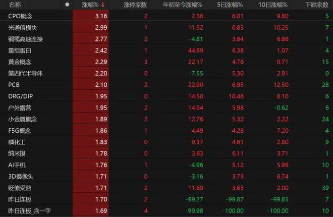 CPO概念涨逾3%,光通信模块、铜缆高速连接涨近3%,重组蛋白、黄金概念、第四代半导体等概念板块涨幅超过2%。