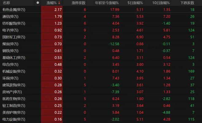 板块分化明显,有色金属涨幅超过2%,电工合金、中孚实业、株冶集团、北方铜业等6只个股涨停;通信板块涨近2%,中光防雷20cm涨停,恒宝股份、二六三也涨停;纺织服饰表现不错,金一文化、飞亚达、云中马均涨停;电子、国防军工、煤炭、钢铁、基础化工板块涨势也不错,华天科技、澳弘电子等9只相关个股涨停,其中太龙股份、创益通20cm涨停。