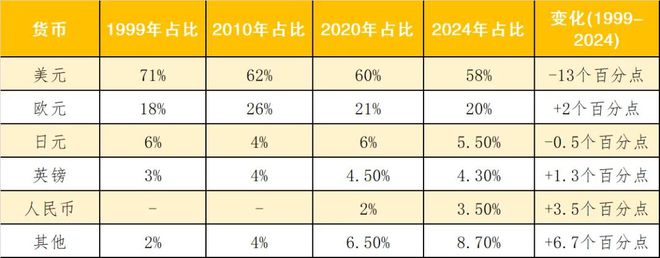 表1:全球外汇储备货币构成变化(1999-2024)(估算数据来源:IMF COFER数据库,相关国家央行报告)制图:张力