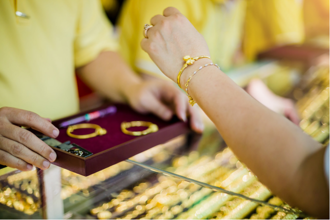 女性顾客和销售人员的手试图佩戴各种类型的黄金珠宝手镯。(图/图虫创意)