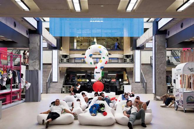 2025年6月4日,四川成都。时尚潮流地标COSMO大厅中躺着的年轻人。大厅中央的问号装置,似乎预示着年轻人孜孜不倦寻找生活答案的过程。(图/视觉中国)