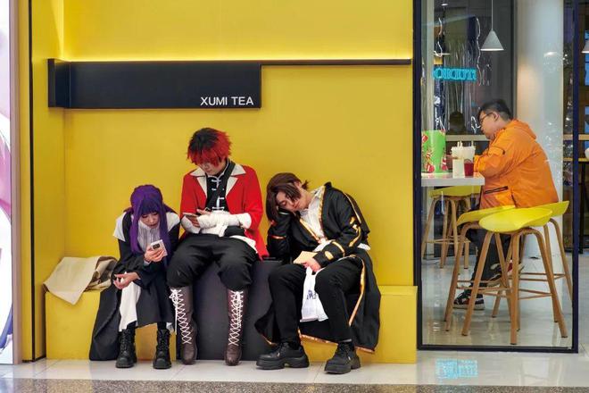 2024年12月29日,上海。百联ZX 造趣场落地五角场商圈,吸引了大批二次元爱好者。一家茶饮店门口的三个coser 和店里的顾客映照出生活的两个面向。(图/视觉中国)
