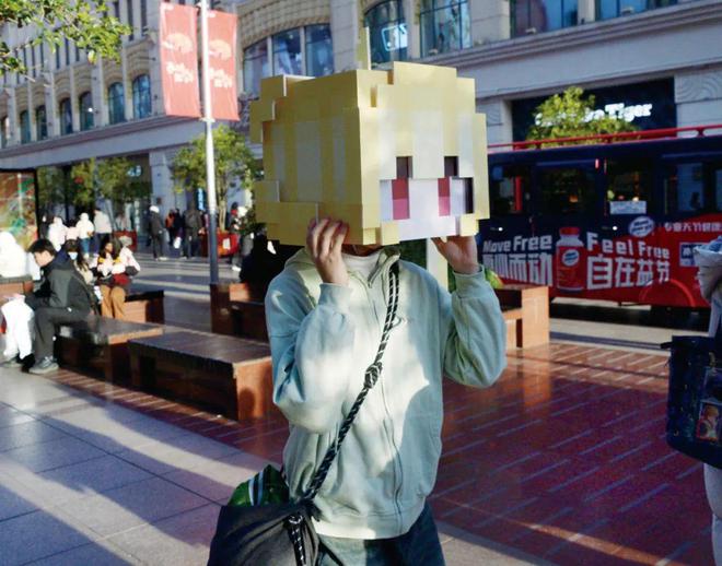 2025年2月7日,上海。南京路步行街上,一位游客戴着《我的世界》主题的玩偶头套逛街。(图/视觉中国)