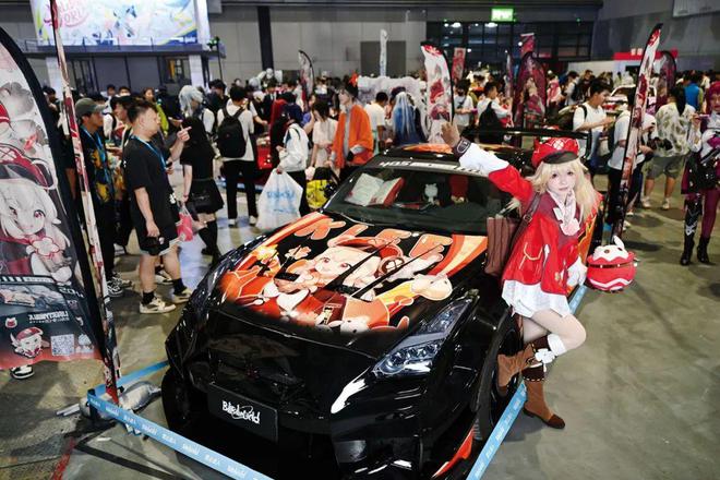 2024年7月12日,大型线下嘉年华 BilibiliWorld2024在上海国家会展中心开幕。图为一辆《原神》游戏角色可莉主题“痛车”和可莉 coser。(图 /IC photo)