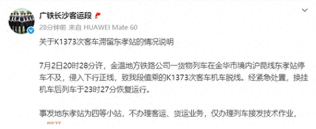 7月5日,广铁长沙客运段发布关于K1373次客车滞留东孝站的情况说明,全文如下: