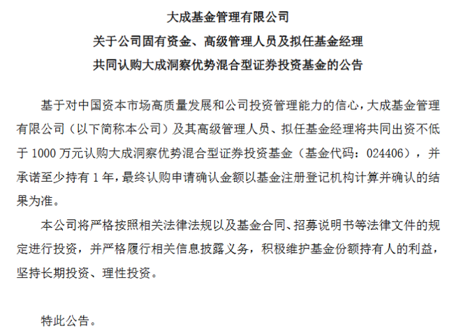 7月4日,大成基金发布公告称,公司及其高级管理人员、拟任基金经理将共同出资不低于1000万元认购大成洞察优势混合型证券投资基金(下称“大成洞察优势”)。