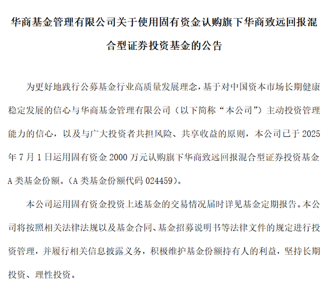 华商基金则于7月1日官宣称,公司已运用固有资金2000万元认购旗下华商致远回报混合型证券投资基金(下称“华商致远回报”)A类基金份额。