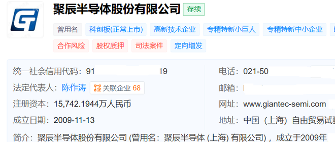 天眼查显示,聚辰股份成立于2009年11月,注册资本为15742.1944万元,法定代表人是陈作涛。