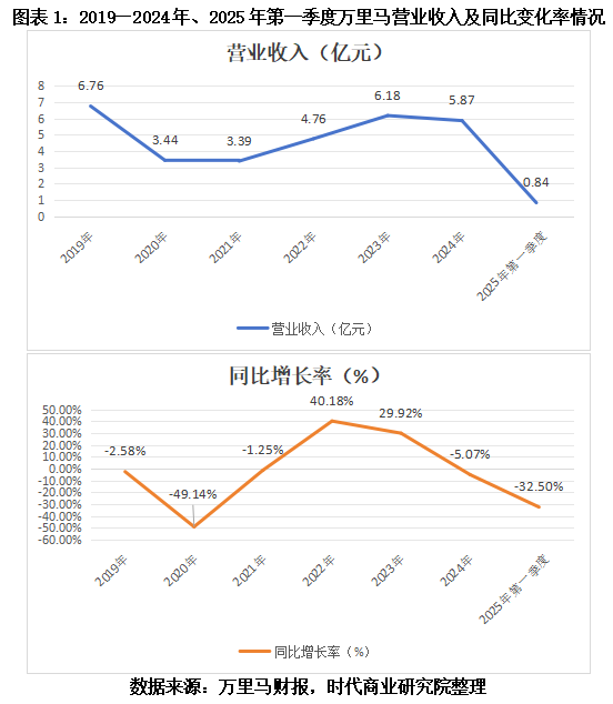 然而,在连续两年实现增收后,2024年和2025年第一季度,万里马营收再度下跌,分别同比下滑5.1%、32.5%。