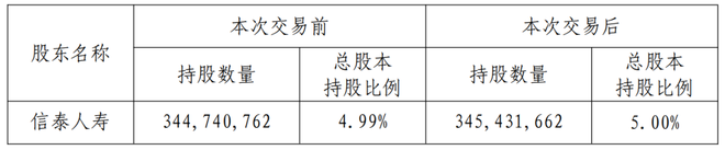 参与交易前,信泰人寿持有华菱钢铁3.447亿股,占其总股本的4.99%;交易完成后,信泰人寿持有华菱钢铁3.454亿股,占其总股本的5.00%。
