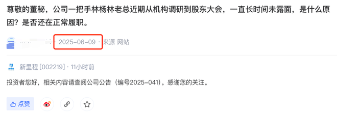 6月9日,有投资者在互动平台上提问称,林杨林一直长时间未露面,是什么原因?上市公司直至7月7日才对其进行回复。
