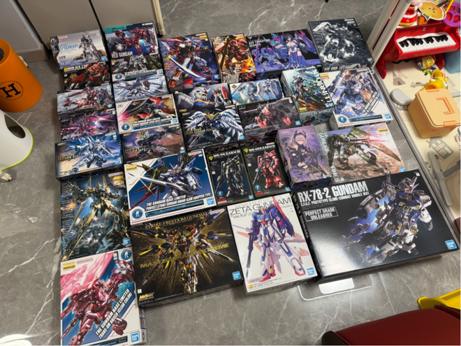 儿子2023年出生后,徐嘉沁拼模型的时间少了,家里堆积着许多未拆的高达模型。(图/受访者提供)