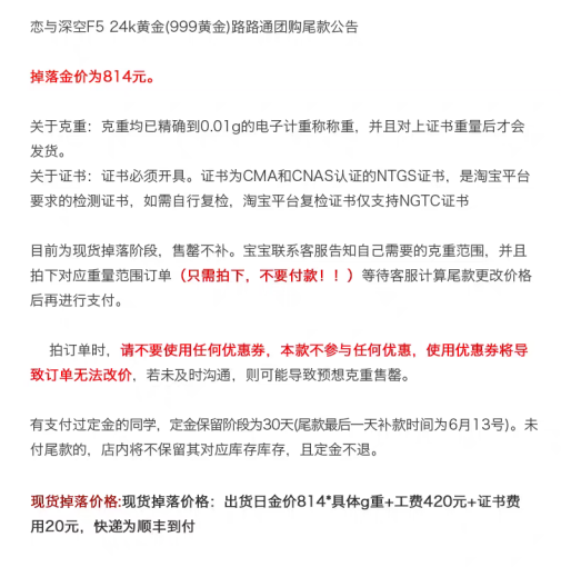 值得注意的是,此前有消费者提到,自己关注的一个痛金团因为质量不过关而流团了。原料克重、成品克重、纯度标准、加工费用、损耗比例,每一个部分都有可能注入水分。就连黄金的鉴定证书,之前也被曝光过有造假的风险。