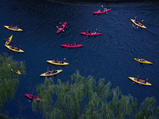 因此,天气稍微转暖之后,就开始有年轻人坐在皮划艇上悠哉地赏岸边簇生的桃花和杏花。皮划艇上的东西也越来越多——蓝牙音箱、野餐篮、小夜灯,有人甚至在皮划艇上调鸡尾酒。
