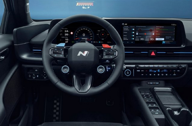 内饰采用全黑涂装,三辐式方向盘上的蓝色驾驶模式按键和红色NGB模式按键格外醒目,仿佛赛车手的手柄。前排一体式运动座椅将驾驶者牢牢包裹,搭配双联屏设计,科技感与战斗气息完美融合。
