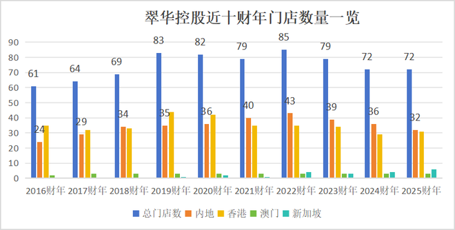 截至2025年3月底,翠华控股于香港、澳门、中国内地及新加坡经营合共72家门店,与2024年3月底持平。在内地市场,翠华控股过去一年并未开店。截至期末,该公司共有32家内地门店,较2024年同期净减少4家。