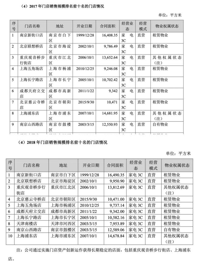 随后的几年间,零售业加速线上线下融合,苏宁在持续转型后,为了凸显智慧零售内涵,于2018年初将中文简称从苏宁云商变更为苏宁易购。在当年披露的2017年年报中,苏宁易购开始披露销售规模排名前十名的门店情况,上海浦东第一店位列第8名;2018年掉落至第10名,随后便“消失”了5年,直到2023年重回榜单第10名。需要注意的是,2023年,该门店的物业所属业态也发展了变化,显示为“租赁”。