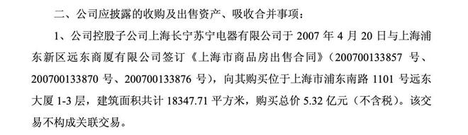 2007年4月20日,上海长宁苏宁电器有限公司与上海浦东新区远东商厦有限公司签订《上海市商品房出售合同》,向其购买位于上海市浦东南路1101号远东大厦1-3 层,建筑面积共计18347.71平方米,购买总价5.32亿元(不含税)。