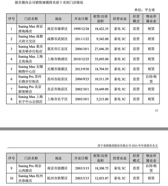 在2024年财报中,苏宁易购销售规模排名前十名的门店名称也已经完成了变更,包括7家Suning Max店和3家Suning Pro店,位于上海的有两家,分别是Suning Max上海五角场店、Suning Max上海长宁中山公园店,这两家门店长期位列榜单前十名。