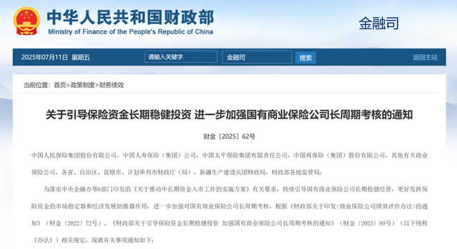 7月11日,财政部印发《关于引导保险资金长期稳健投资 进一步加强国有商业保险公司长周期考核的通知》(下称《通知》),明确国有商业保险公司全面建立三年以上长周期考核机制,同时要求国有商业保险公司提高资产负债管理水平,注重稳健经营,增强投资管理能力。