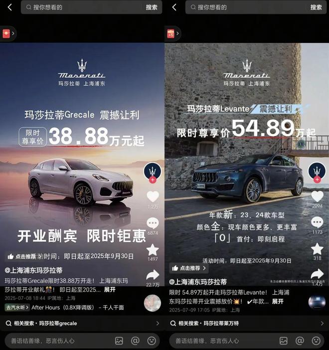 “玛莎拉蒂开业大酬宾,震撼让利,38.88万就能开走Grecale,54万就能开走Levante!”(图/抖音@上海浦东玛莎拉蒂)