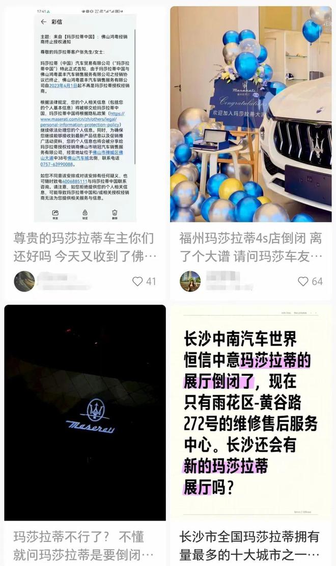 不少车主吐槽玛莎拉蒂“现在连修的地方都难找了”,甚至有车主哭诉自己得到邻省的门店去保养。(图/社交平台截图)