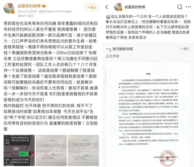 事情还要从一周前说起。8月2日晚上,演员赵露思发长文控诉其经纪公司银河酷娱,她表示,银河酷娱在她治疗期间(赵露思此前诊断出抑郁症,并因此停工一段时间)曾承诺为她被迫取消的代言负责,最后却直接从她工作室的账户中划走205万元;再三沟通也不愿意归还工作室运营权,团队工作人员缺失;等待八个月都没有解决剧组解散相关问题,最后由艺人进行赔偿,并以可能遭“封杀”为警示;解约协商无果,接下来将交由警方处理。