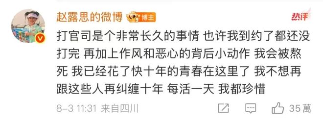 “打官司是个非常长久的事情 也许我到约了都还没打完 再加上作风和恶心的背后小动作 我会被熬死 我已经花了快十年的青春在这里了 我不想再跟这些人再纠缠十年 每活一天 我都珍惜”。在转发公司回应声明后,赵露思在评论区里这样写道。
