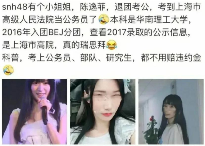 在一砖头下去能砸出十场解约风波的娱乐圈中,也有真正的勇士靠法律武器成为内娱目前唯一一个0违约金解约的艺人,比如SNH48的陈逸菲。退圈后,陈逸菲在2017年通过公务员考试入职上海市金山区人民法院,2024年还参与了法治宣传片的拍摄。