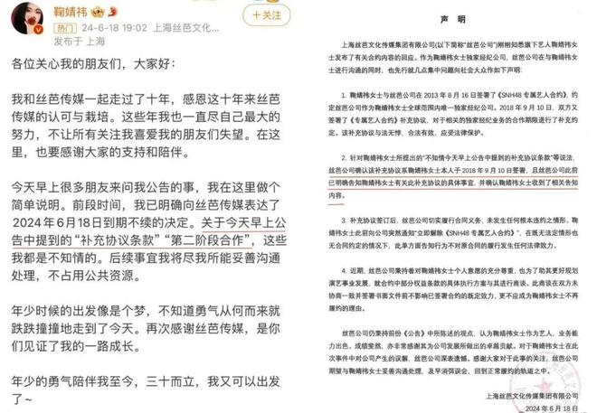 去年6月,鞠婧祎与上海丝芭文化传媒解约风波也曾引发热议。在鞠婧祎宣布合同到期解约后,丝芭传媒却称双方存在补充协议,并根据补充协议条款正式过渡到第二段合作之中,鞠婧祎方则回应该说法为捏造,已起诉并申请法院进行笔迹鉴定。