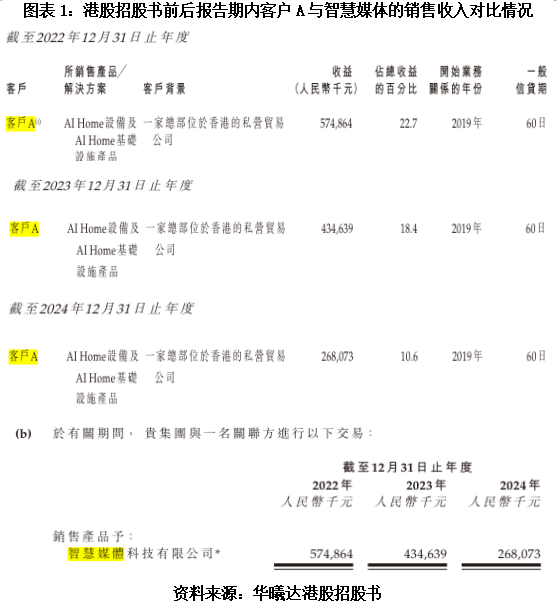 通过港股招股书中披露的关联交易情况对比发现,华曦达对客户A与智慧媒体科技有限公司(下称“智慧媒体”)的销售收入情况完全一致,由此不难推断,客户A应该是智慧媒体。