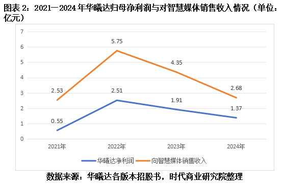 通过对比不难发现,华曦达近年来的归母净利润变化趋势,与对智慧媒体销售收入的变化趋势保持高度一致。北交所及港股招股书显示,2021—2024年,华曦达的归母净利润分别为0.55亿元、2.51亿元、1.91亿元、1.37亿元,2022—2024年,其同比变动率分别为356.36%、-23.90%、-28.27%;其对智慧媒体的关联销售收入分别为2.53亿元、5.75亿元、4.35亿元、2.68亿元,2022—2024年,其同比变动率分别为127.27%、-24.34%、-38.39%。