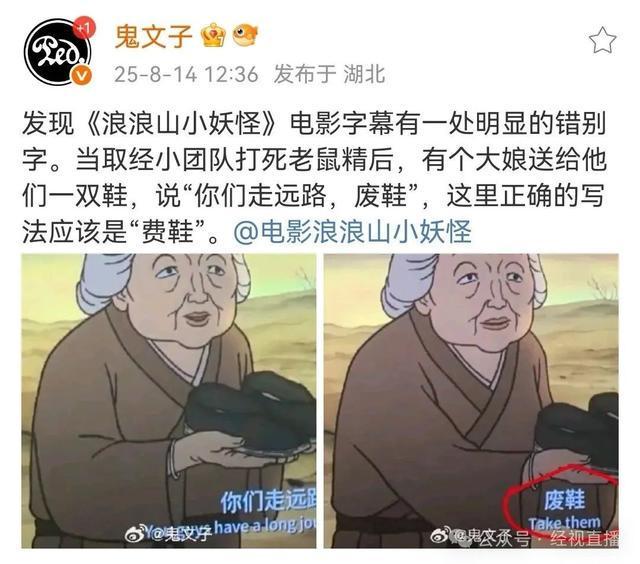 近日,暑期热映的国产二维动画电影《浪浪山小妖怪》因一处字幕用词引发关注。有网友指出,影片中取经小团队打死老鼠精后,一位大娘在赠鞋时说道“你们走远路,废鞋”,字幕中将此处表述为“废鞋”,而网友认为正确写法应为“费鞋”。