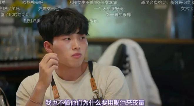 二号男嘉宾胜理误会了志受对“男子气概”的偏爱,在约会中自顾自地和潜在情敌相昊拼起了酒量,全然忘记约会的本质是与心动的她深入交流。哪怕女生已经再三明示“现在不是喝醉和比赛的时候”,两位男嘉宾却已经沉醉在“我不能输”与“这就是竞争”的有毒较量中无法自拔,剩下两位女生尴尬而无语地愣在原地。