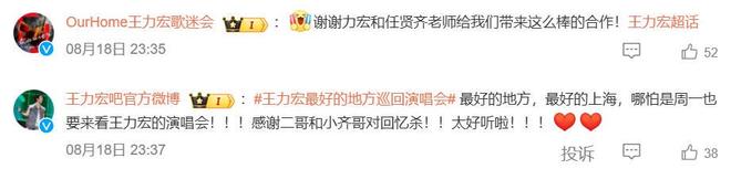 王力宏上海演唱会也吸引到很多明星朋友到场,8月17日,中国乒乓球运动员许昕在社交平台发布与妻子姚彦一起看王力宏演唱会的视频,并配文:“这才是小时候的味道,回忆拉满!!!沉浸式唱歌享受其中~全程跟唱的感觉太爽了!!!”