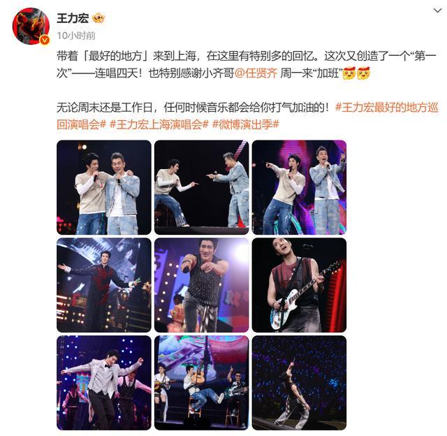 18日晚,王力宏发文告别上海,他写到:带着“最好的地方”来到上海,在这里有特别多的回忆。这次又创造了一个“第一次”——连唱四天!也特别感谢小齐哥@任贤齐周一来“加班”。